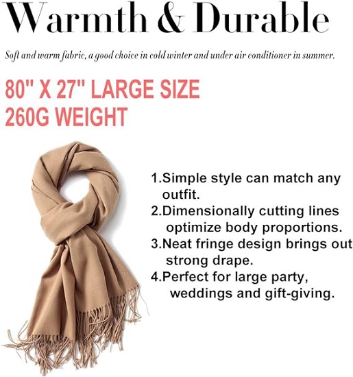 • 【Softness】This scarf is large, warm, lightweight and soft, feels like cashmere. 80" long (74" + 3" tassels on each side), 27" wide, and weighs 9.1 oz. Still durable and soft after many washes.